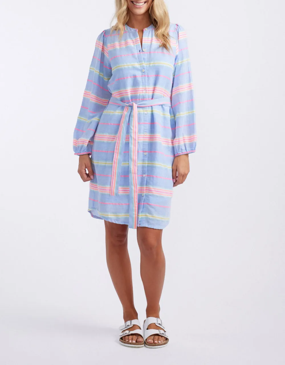 The relaxed fit and long sleeves with elastic cuffs make it ideal for warm days or breezy nights. A lovely lightweight design, this dress offers an effortless style with a fun pop of colour. The matching fabric tie belt lets you wear it your way—cinch it at the waist for a more defined look or leave it loose for casual ease (great over bathers!).
